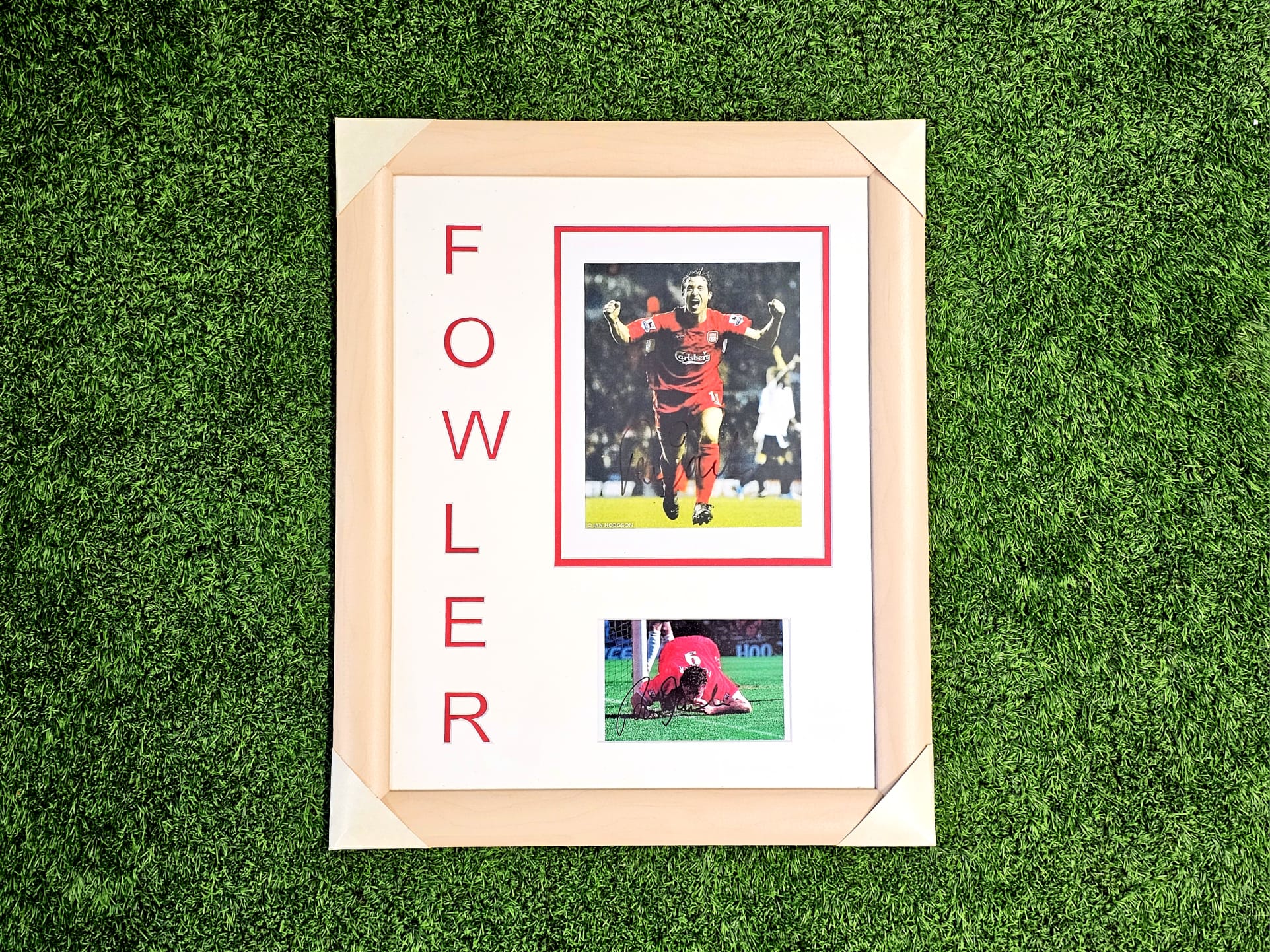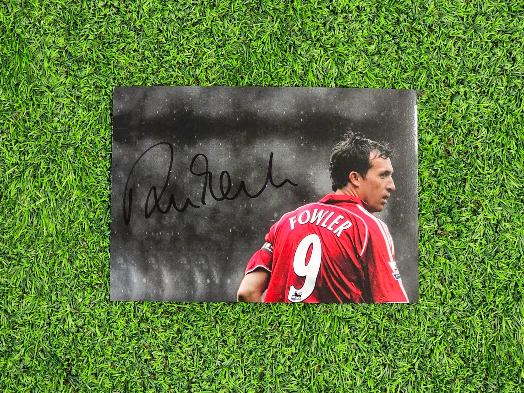 We have 100 high-quality signed photos of Liverpool legend Robbie Fowler (15 x 21 cm) available. Each photo is authentic and beautifully presented, perfect for any fan or collector.